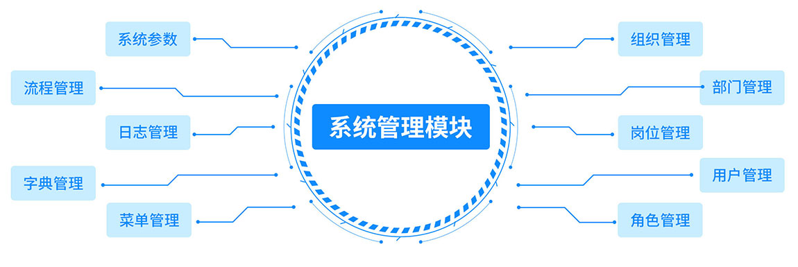 系統(tǒng)管理模塊提供各項(xiàng)基礎(chǔ)參數(shù)配置,用于支撐系統(tǒng)人員層級(jí)的管理和人員權(quán)限的控制以及離散屬性的配置如各項(xiàng)閥值等。包含組織管理、部門(mén)管理、崗位管理、角色管理、用戶(hù)管理、菜單管理、字典管理、日志管理、系統(tǒng)參數(shù)、流程管理。